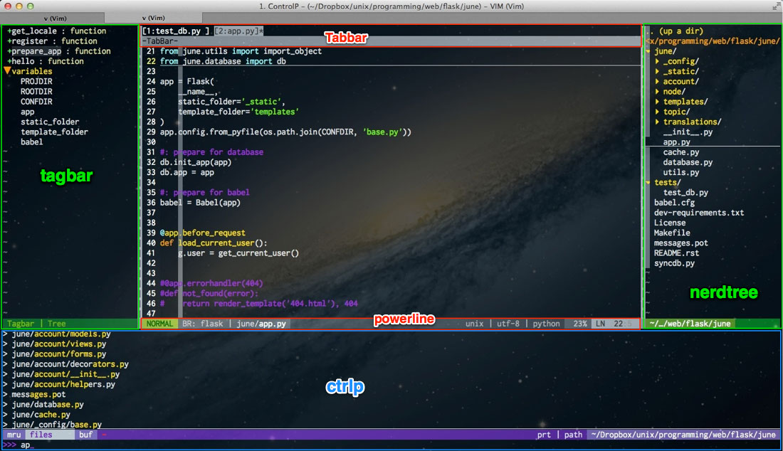 • If you are new to vim, I recommend not using plugins until you are comfortable with vim’s out-of-the-box functionality. However, the plugins in the photo above are as named in the picture: tagbar, tabbar, powerline, nerdtree, and ctrlp. When and if you do decide to begin experimenting with these plugins, I recommend Vundle, which is essentially a vim plugin manager.