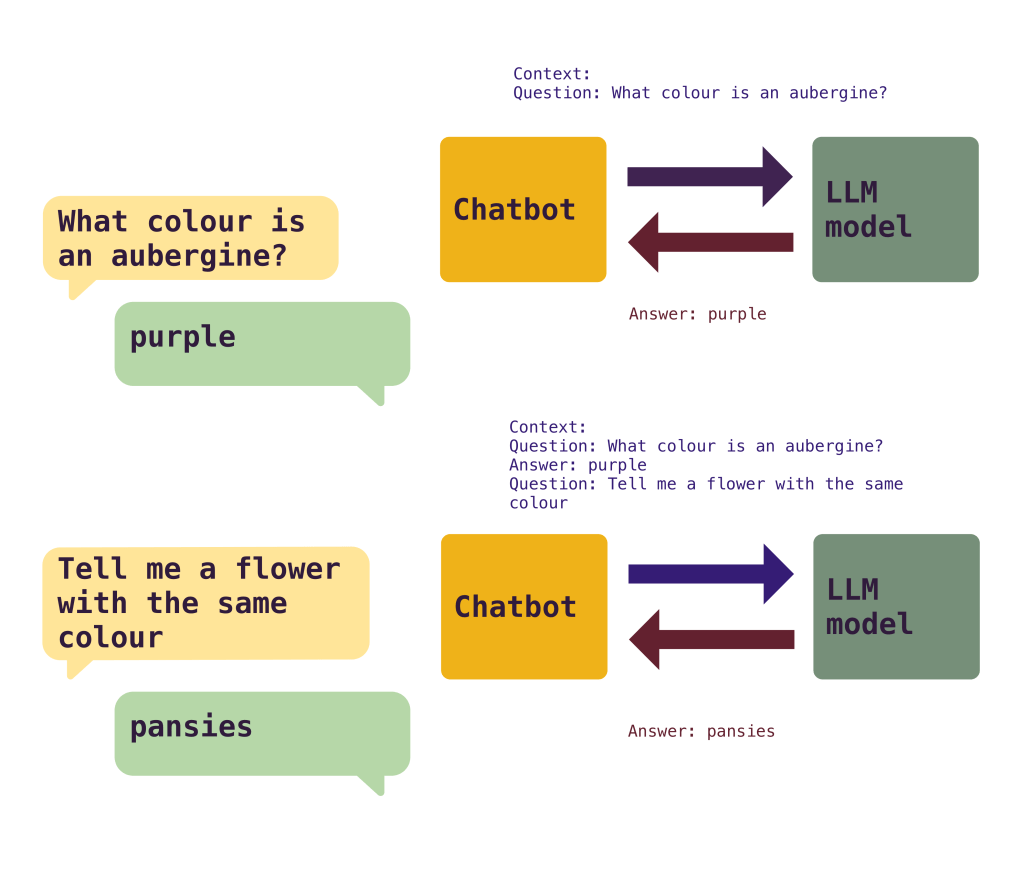 But, when using AI tools, for example a chat bot, you see that you have a conversation. And it continues the conversation and references things said before. And that is because the chat bot itself maintains and references the context back and forth. In a naive way, it stores the conversation and sends it whole to the model for each question, making the LLM understand what was discussed before and continue when it left.